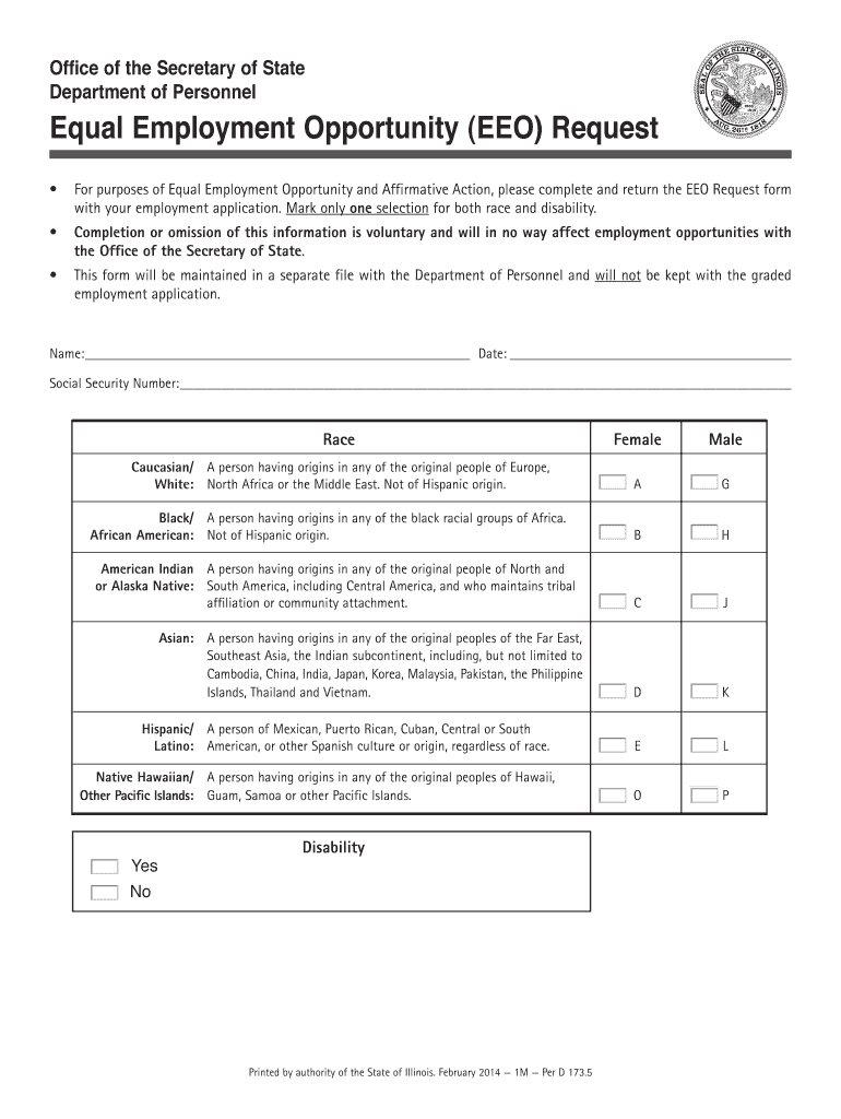 Providing your race and disability information on the Illinois EEO Request Form is voluntary and will not affect your employment opportunities. You can skip these questions if you prefer.