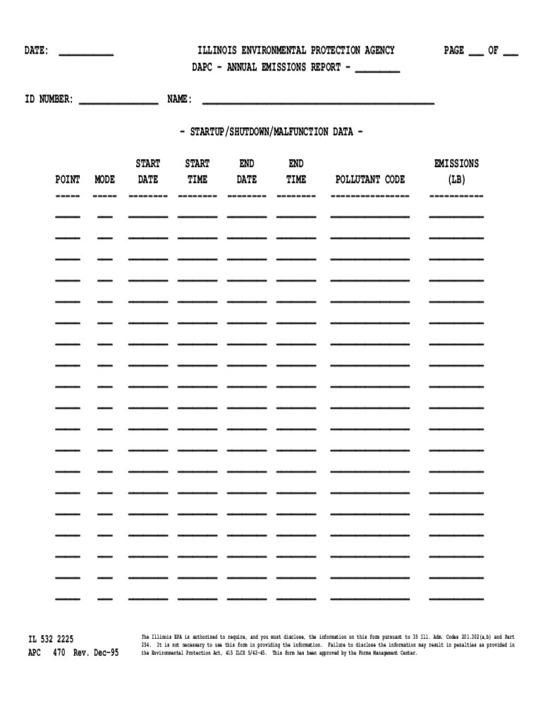 DATE: ILLINOIS ENVIRONMENTAL PROTECTION AGENCY APC ANNUAL EMISSIONS REPORT ID NUMBER: NAME:PAGE OF STARTUP/SHUTDOWN/MALFUNCTION DATA POINT MODE IL 532 2225 APC 470 Rev. Dec95START DATE START TIME