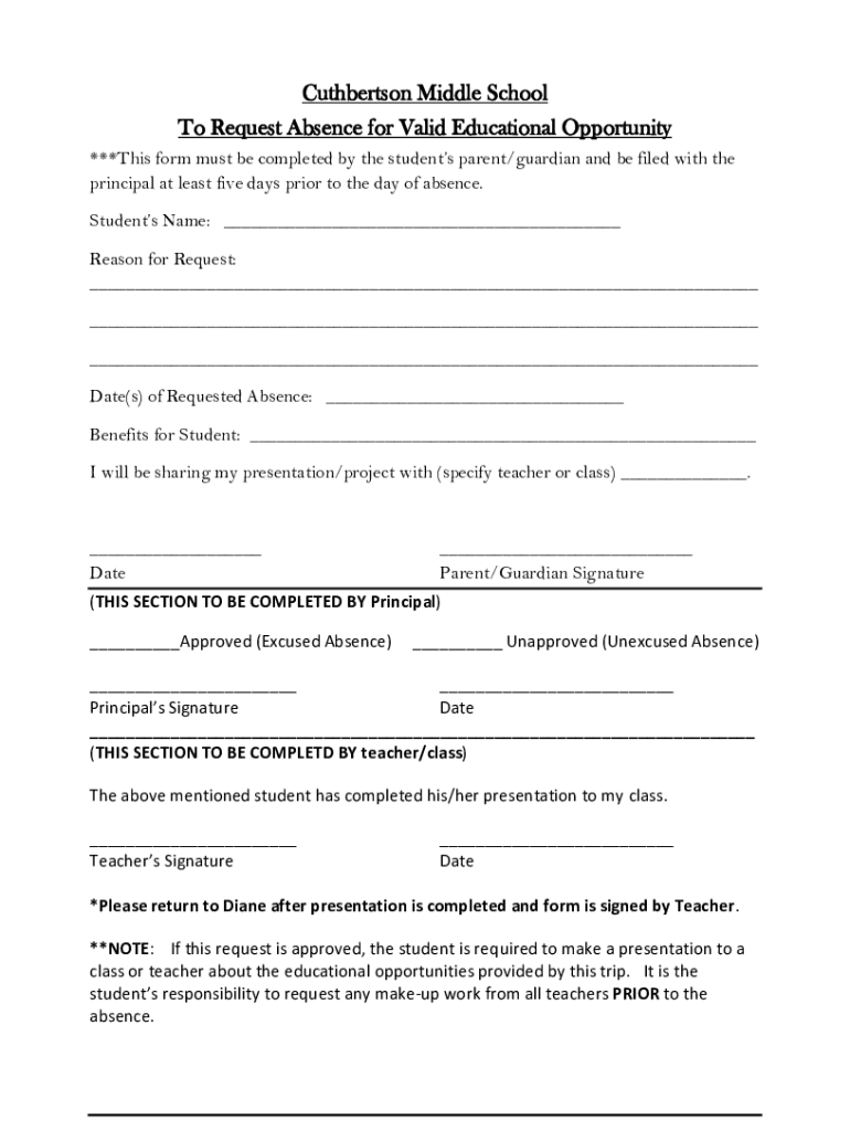 Culbertson Middle School To Request Absence for Valid Educational Opportunity ***This form must be completed by the students parent/guardian and be filed with the principal at least five days prior