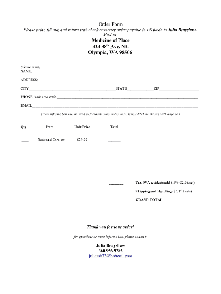 Order Form Please print, fill out, and return with check or money order payable in US funds to Julia Bradshaw. Mail to:Medicine of Place 424 38th Ave. NE Olympia, WA 98506 (please print) NAME: ADDRESS: