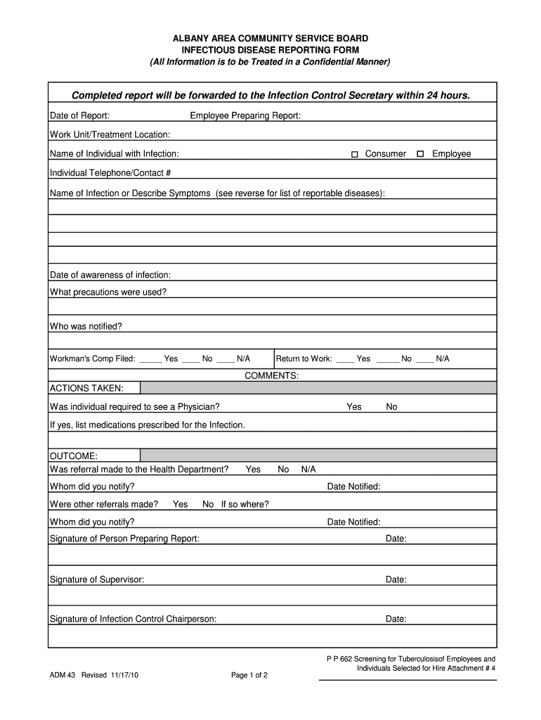 ALBANY AREA COMMUNITY SERVICE BOARD INFECTIOUS DISEASE REPORTING FORM (All Information is to be Treated in a Confidential Manner) Completed report will be forwarded to the Infection Control Secretary