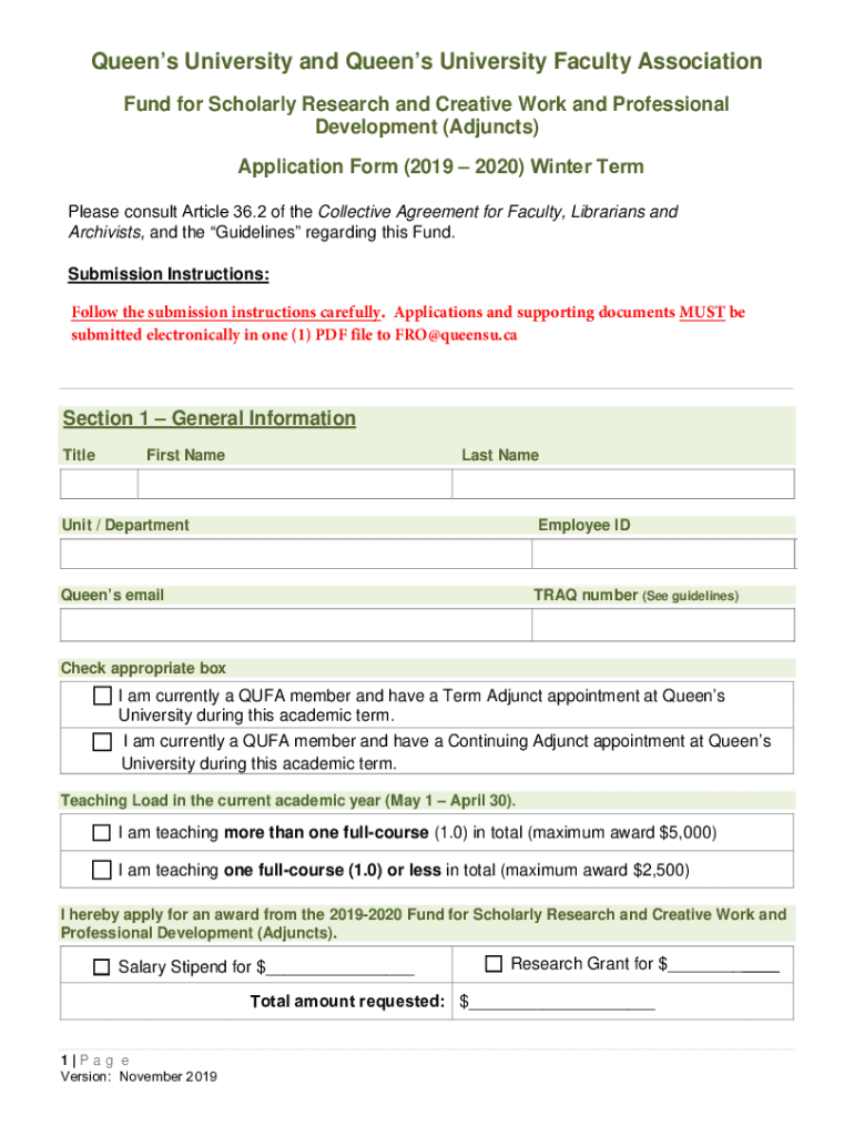 Queen's University and Queen's University Faculty Association Fund for Scholarly Research and Creative Work and Professional Development (Adjuncts) Application Form (2019 2020) Winter Term Please
