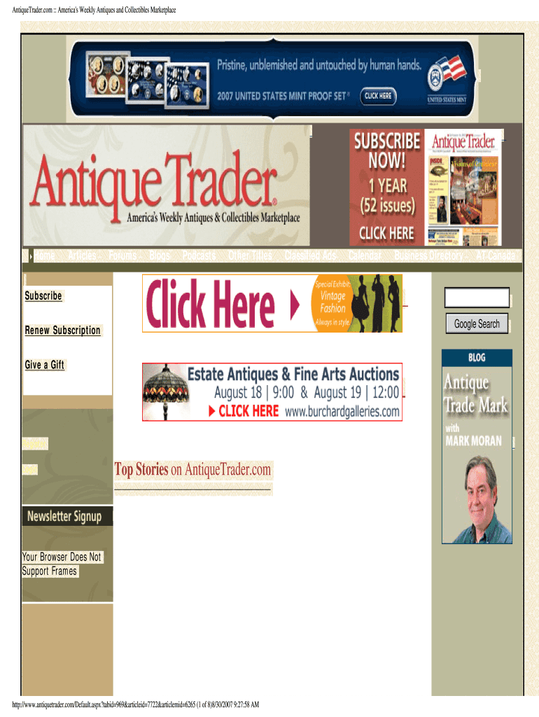AntiqueTrader.com :: America's Weekly Antiques and Collectibles Marketplace Home Articles Forums Blogs Podcasts Other Titles Classified Ads Calendar Business Directory AT Canada Subscribe Google Search