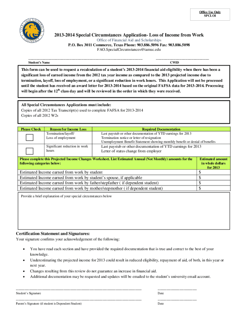 Office Use Only SPCLOI20132014 Special Circumstances Application Loss of Income from Work Office of Financial Aid and Scholarships P.O. Box 3011 Commerce, Texas Phone: 903.886.5096 Fax: 903.886.5098