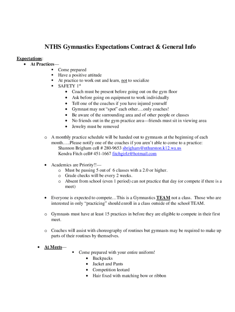 NHS Gymnastics Expectations Contract & General Info Expectations: At Practices Come prepared Have a positive attitude At practice to work out and learn, not to socialize SAFETY 1st Coach must be present