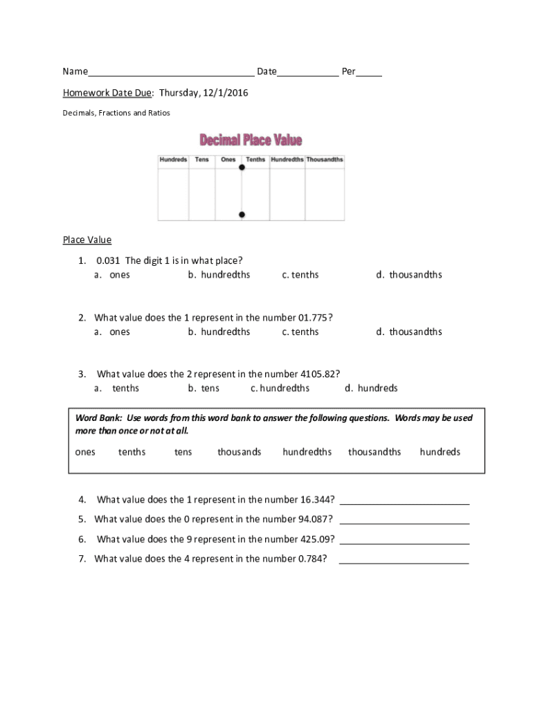 Name Date Per Homework Date Due: Thursday, 12/1/2016 Decimals, Fractions and RatiosPlace Value 1. 0.031 The digit 1 is in what place? a. ones b. hundredths. Tenths2. What value does the 1 represent