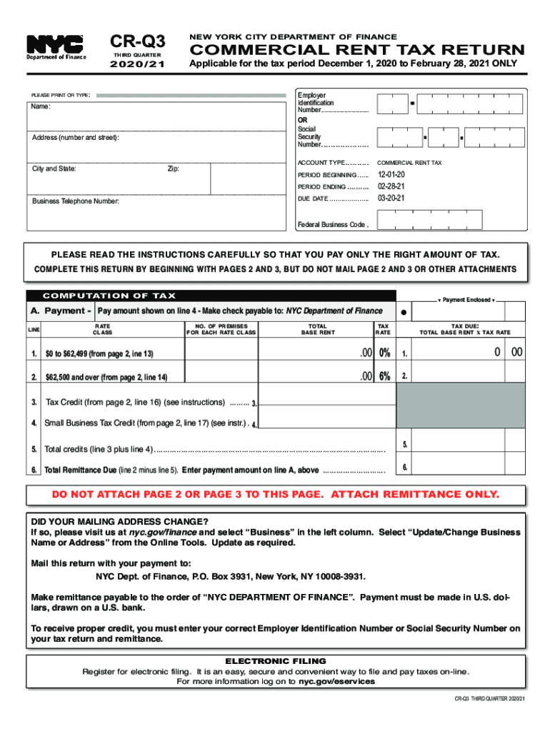 NEW YORK CITY DEPARTMENT OF FINANCECRQ3COMMERCIAL RENT TAX RETURNTHIRD QUARTERApplicable for the tax period December 1, 2020, to February 28, 2021 ONLY2020/21PLEASE PRINT OR TYPE:Name: Address (number