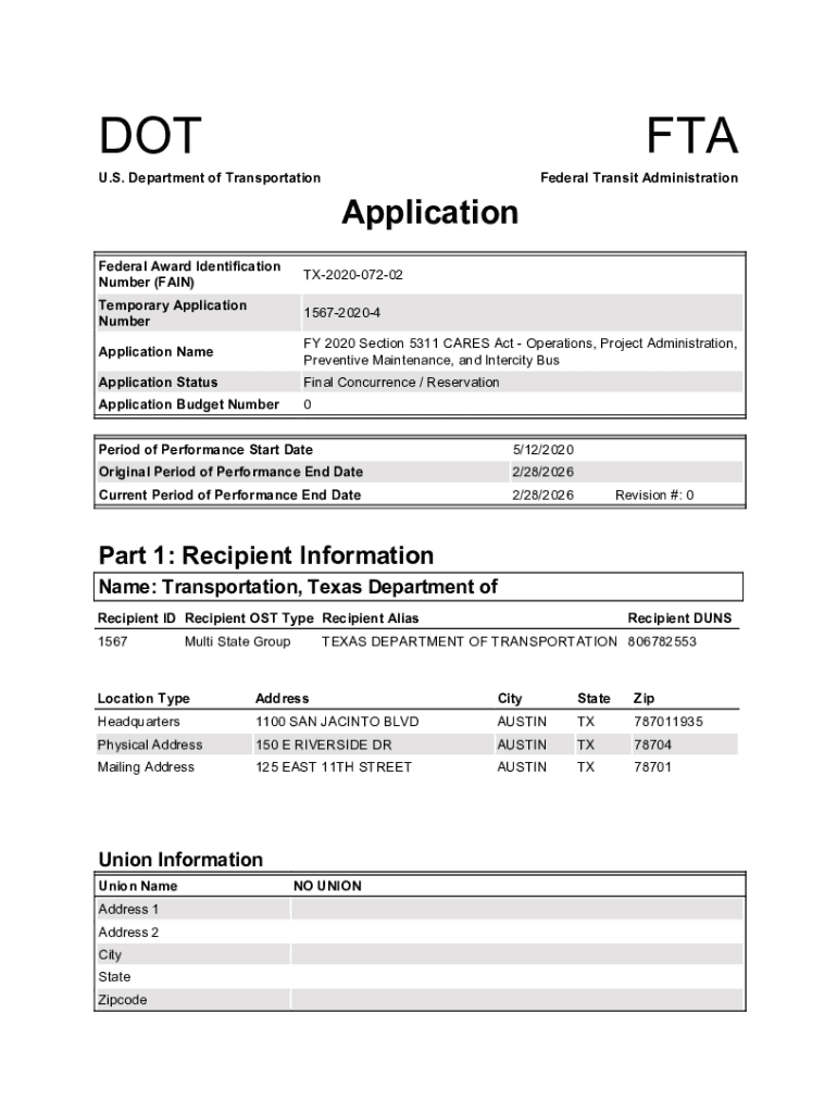 DOTTED. S. Department of Transportation Federal Transit AdministrationApplication Federal Award Identification Number (FAIN)TX202007202Temporary Application Number156720204Application Namely 2020