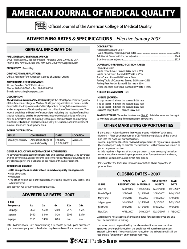 AMERICAN JOURNAL OF MEDICAL QUALITY Official Journal of the American College of Medical QualityADVERTISING RATES & SPECIFICATIONS Effective January 2007 COLOR RATES: Additional Standard Color (Cyan,