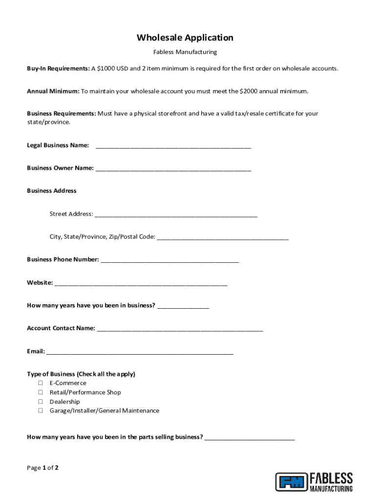 Wholesale Application Fables's Manufacturing Buying Requirements: A $1000 USD and 2 item minimum is required for the first order on wholesale accounts. Annual Minimum: To maintain your wholesale account