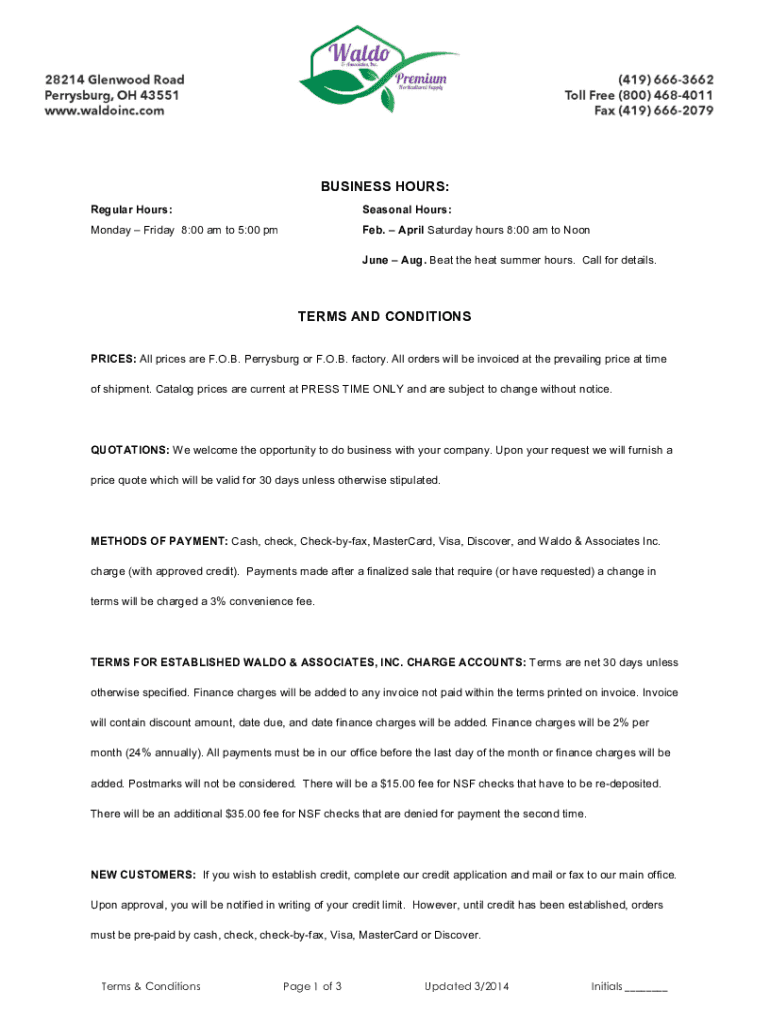 BUSINESS HOURS: Regular Hours:Seasonal Hours:Monday Friday 8:00 am to 5:00 pm Feb. April Saturday hours 8:00 am to Noon June Aug. Beat the heat summer hours. Call for details. TERMS AND CONDITIONS