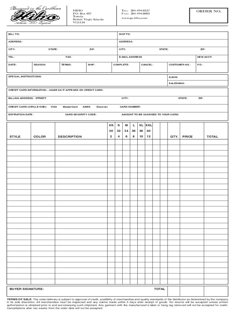 Get the free HIHO TEL: 284-494-0337 ORDER NO. P.O. Box 857 FAX: 284-494 ...