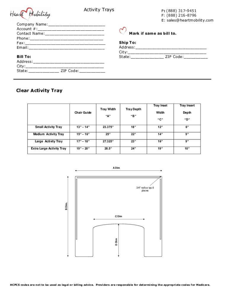 Activity Trays: (888) 3179451 F: (888) 2168796 E: sales heart mobility. Company Name: Account #: Contact Name: Phone: Fax: Email: Mark if same as bill to. Ship To: Address: City: State: ZIP Code: