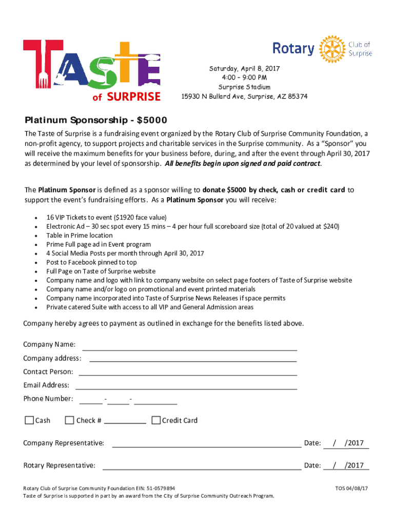 Of Saturday, April 8, 2017 4:00 9:00 PM Surprise Stadium 15930 N Ballard Ave, Surprise, AZ 85374SURPRISEPlatinum Sponsorship $5000 The Taste of Surprise is a fundraising event organized by the Rotary