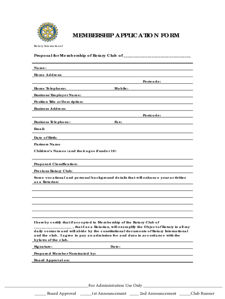 MEMBERSHIP APPLICATION FORM Rotary InternationalProposal for Membership of Rotary Club of Name: Home Address: Postcode: Home Telephone:Mobile:Business/Employer Name: Position Title or Description: