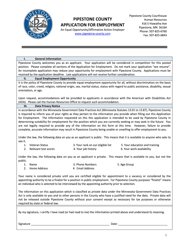 Anyone interested in employment with Pipestone County is eligible to use the Pipestone County Employment Application. It's the primary form for applying to job vacancies within the county's municipal services.