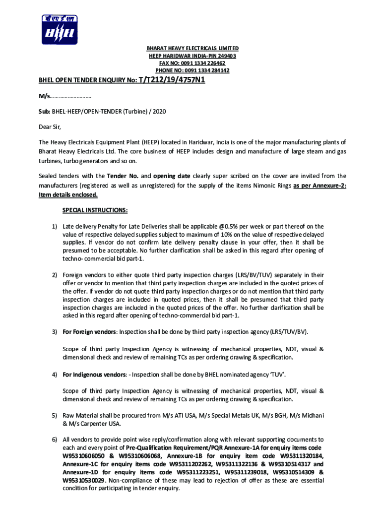 Get the free BHEL OPEN TENDER ENQUIRY No: T/T212/19/4757N1
