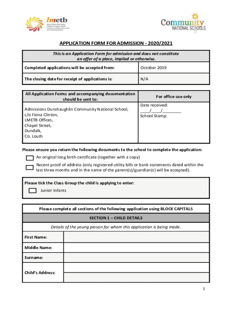APPLICATION FORM FOR ADMISSION 2020/2021 This is an Application Form for admission and does not constitute an offer of a place, implied or otherwise. Completed applications will be accepted from:October