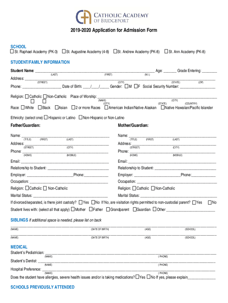 20192020 Application for Admission Form SCHOOL St. Raphael Academy (PK3)St. Augustine Academy (48)St. Andrew Academy (PK8)St. Ann Academy (PK8)STUDENT/FAMILY INFORMATION Student Name: Age: Grade Entering: