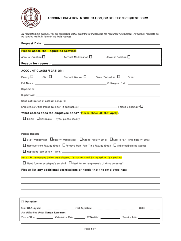 ACCOUNT CREATION, MODIFICATION, OR DELETION REQUEST Form requesting this account, you are requesting that IT grant the user access to the resources noted below. All account requests will be handled