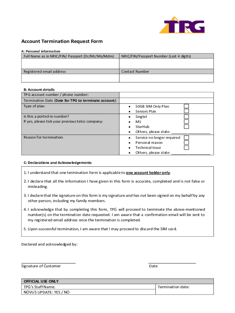 Account Termination Request Form A: Personal informational Name as in ERIC/FIN/ Passport (Dr/Mr/Ms/MDM)ERIC/FIN/Passport Number (Last 4 digits)Registered email addressContact Number: Account details
