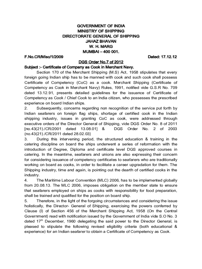 GOVERNMENT OF INDIA MINISTRY OF SHIPPING DIRECTORATE GENERAL OF SHIPPING JAPAN HAVEN W. H. MARY MUMBAI 400 001. F. No.CR/Misc/1/2009 Dated: 17.12.12 DGS Order No.7 of 2012 Subject : Certificate of