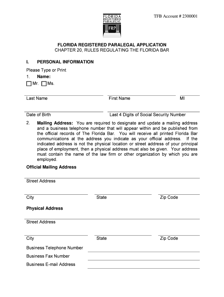 TFB Account # 2300001 FLORIDA REGISTERED PARALEGAL APPLICATION CHAPTER 20, RULES REGULATING THE FLORIDA BAR I. PERSONAL INFORMATION Please Type or Print Name: 1. Mr. Ms. Last Name Date of Birth 2.