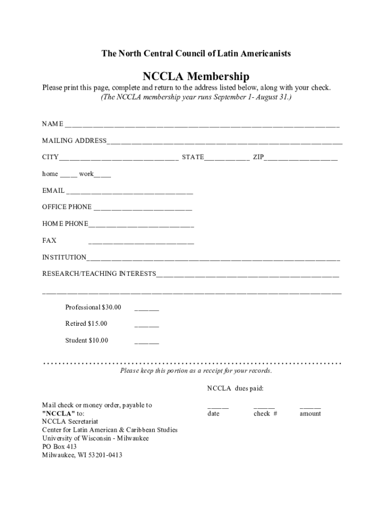 The North Central Council of Latin AmericanistsNCCLA Membership Please print this page, complete and return to the address listed below, along with your check. (The NC CLA membership year runs September