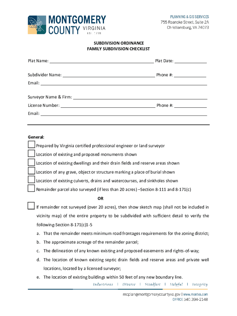 SUBDIVISION ORDINANCE FAMILY SUBDIVISION CHECKLIST Plat Name: Plat Date: Subdivider Name: Phone #: Email: Surveyor Name & Firm: License Number: Phone #: Email: General: Prepared by Virginia certified