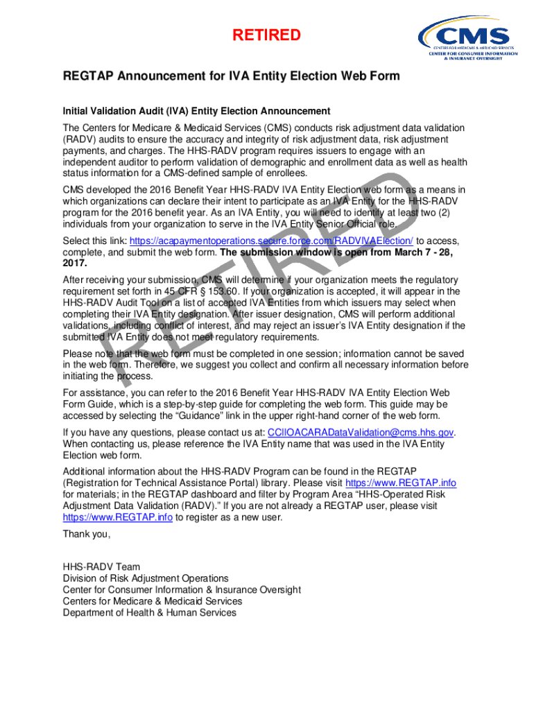 RETIRED REG TAP Announcement for IVA Entity Election Web Form Initial Validation Audit (IVA) Entity Election Announcement The Centers for Medicare & Medicaid Services (CMS) conducts risk adjustment