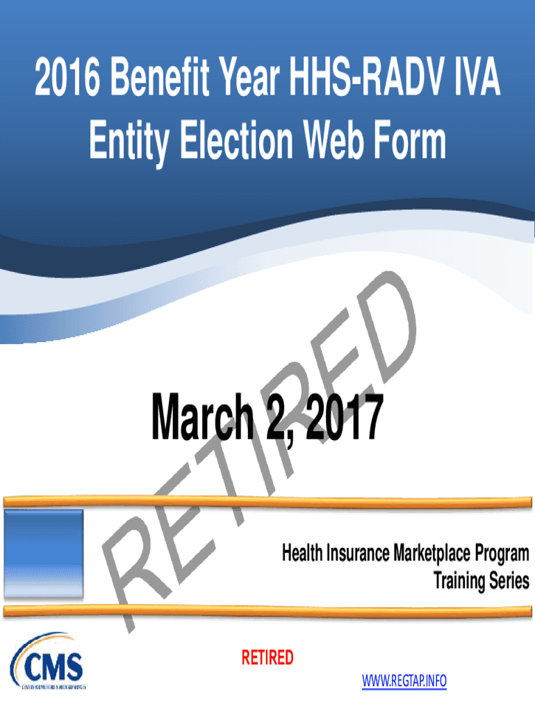 2016 Benefit Year CHARADE IVA Entity Election Web Form March 2, 2017, Health Insurance Marketplace Program Training Series RETIRED WWW.REG TAP. Intersession Agenda Session Guidelines Intended Audience