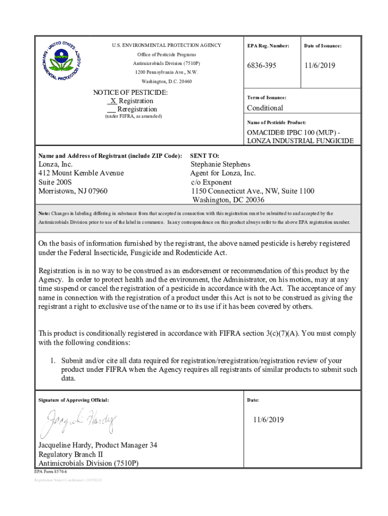 U.S. ENVIRONMENTAL PROTECTION AGENCY EPA Reg. Number:Date of Issuance:683639511/6/2019Office of Pesticide Programs