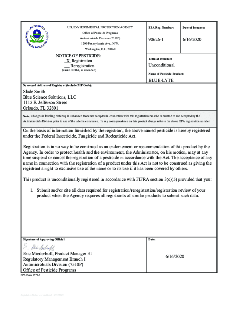 U.S. ENVIRONMENTAL PROTECTION AGENCY EPA Reg. Number:Date of Issuance:9062616/16/2020Office of Pesticide Programs