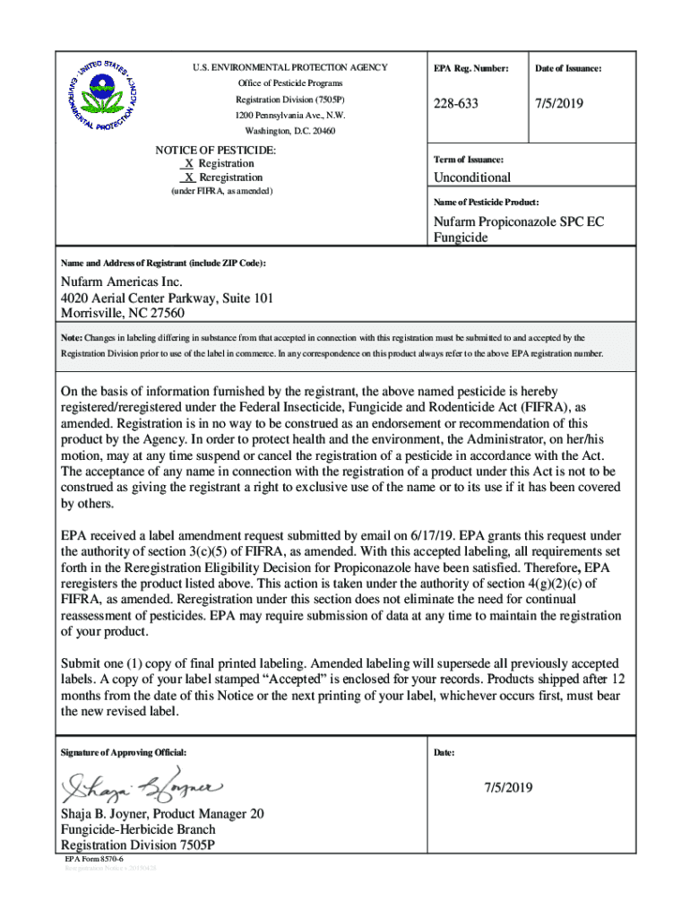 U.S. ENVIRONMENTAL PROTECTION AGENCY EPA Reg. Number:Date of Issuance:2286337/5/2019Office of Pesticide Programs