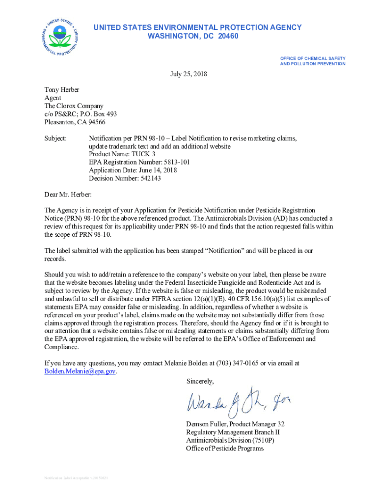 UNITED STATES ENVIRONMENTAL PROTECTION AGENCY WASHINGTON, DC 20460 OFFICE OF CHEMICAL SAFETY AND POLLUTION PREVENTION July 25, 2018, Tony Herbert Agent The Clorox Company c/o PRC; P.O. Box 493 Pleasant