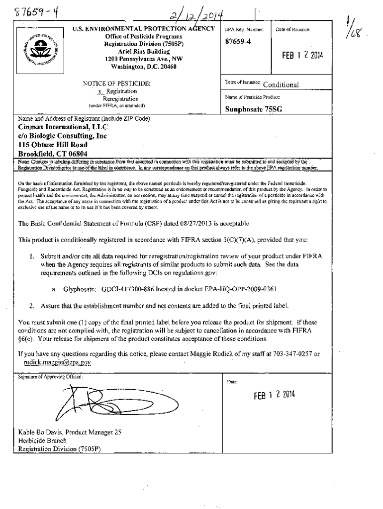 Get the free US EPA, Pesticide Product Label, SUNPHOSATE 75SG, 02/12/2014. Pesticide Product Labe...