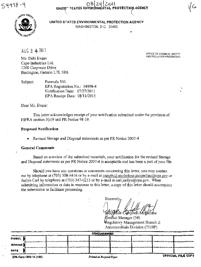 STATES ENVIRONMENTAL PROTECTIONAGENCYUNITED STATES ENVIRONMENTAL PROTECTION AGENCY WASHINGTON, D.C. 20460U)AAU 242011 1OFFICE OF CHEMICAL SAFETY Ms. Debt Evans Capo Industries Ltd. 1200 Corporate