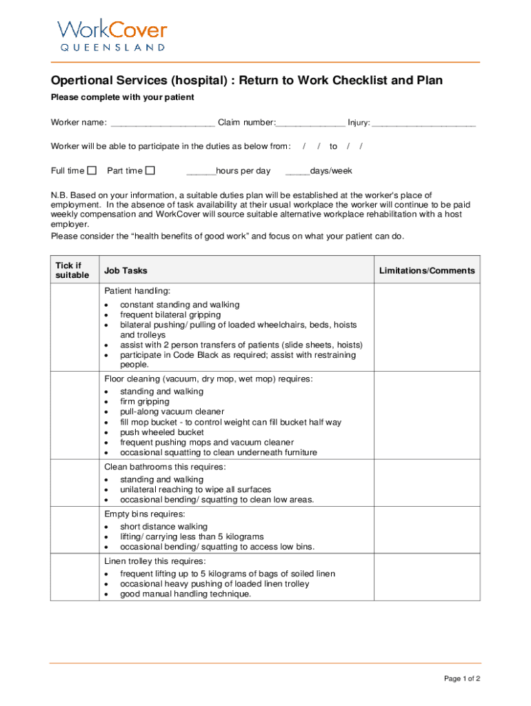 Operational Services (hospital) : Return to Work Checklist and Plan Please complete with your patient Worker name: Claim number: Injury: Worker will be able to participate in the duties as below from: