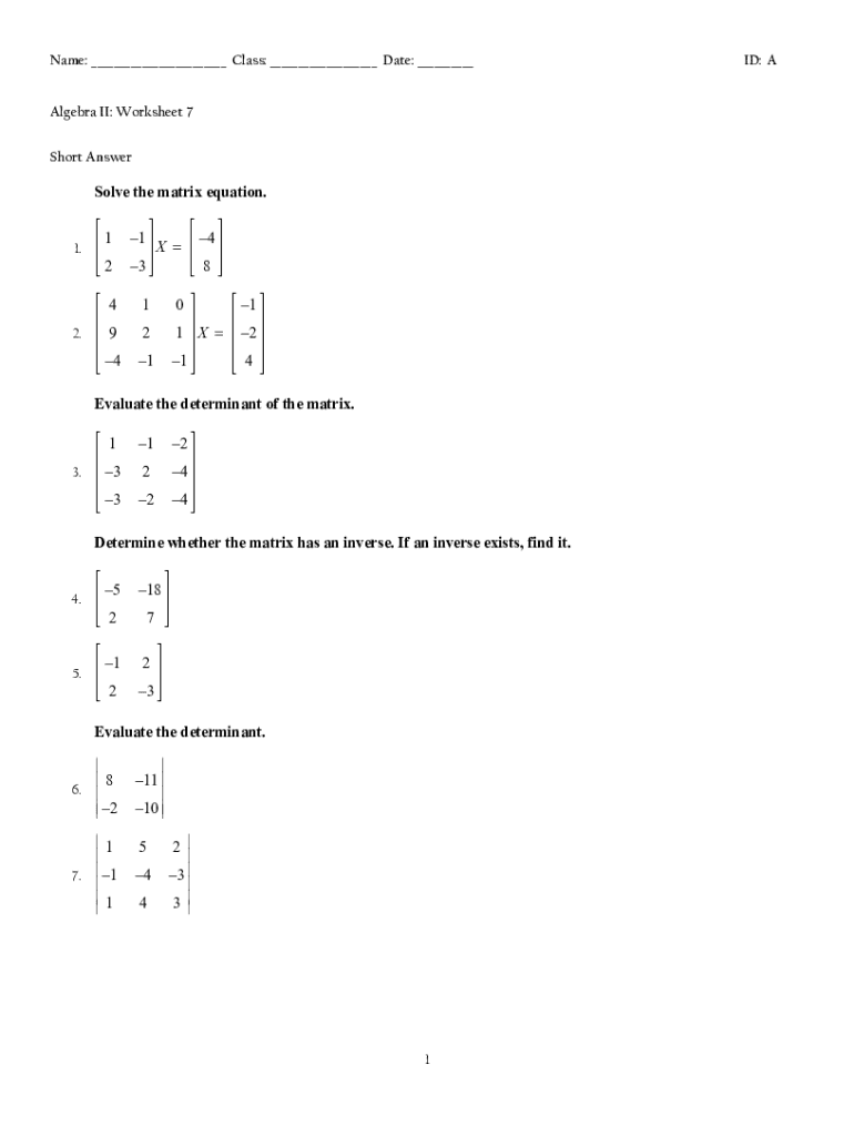 Name: Class: Date: Algebra II: Worksheet 7 Short Answerable the matrix equation. 1 1. 2 4 1 × 3 8 4 1 0 × 2 1 2. 9 4 1 1 1 2 4 Evaluate the determinant of the matrix