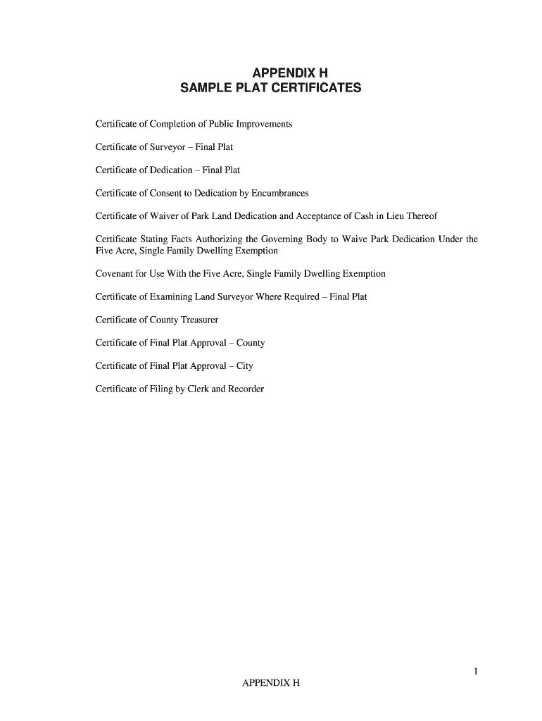 APPENDIX H SAMPLE PLAT CERTIFICATES Certificate of Completion of Public Improvements Certificate of Surveyor Final Plat Certificate of Dedication Final Plat Certificate of Consent to Dedication by