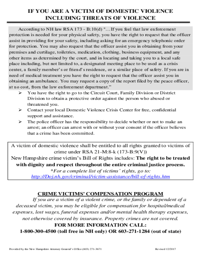 IF YOU ARE A VICTIM OF DOMESTIC VIOLENCE INCLUDING THREATS OF VIOLENCE According to NH law RSA 173 B:10(d) “If you feel that law enforcement protection is needed for your physical safety, you have