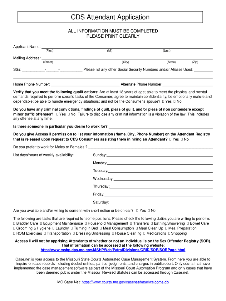 CDS Attendant Application ALL INFORMATION MUST BE COMPLETED PLEASE PRINT CLEARLY Applicant Name: (First)(MI)(Last)Mailing Address: (Street)(City)(State)(Zip)SS#: Please list any other Social Security