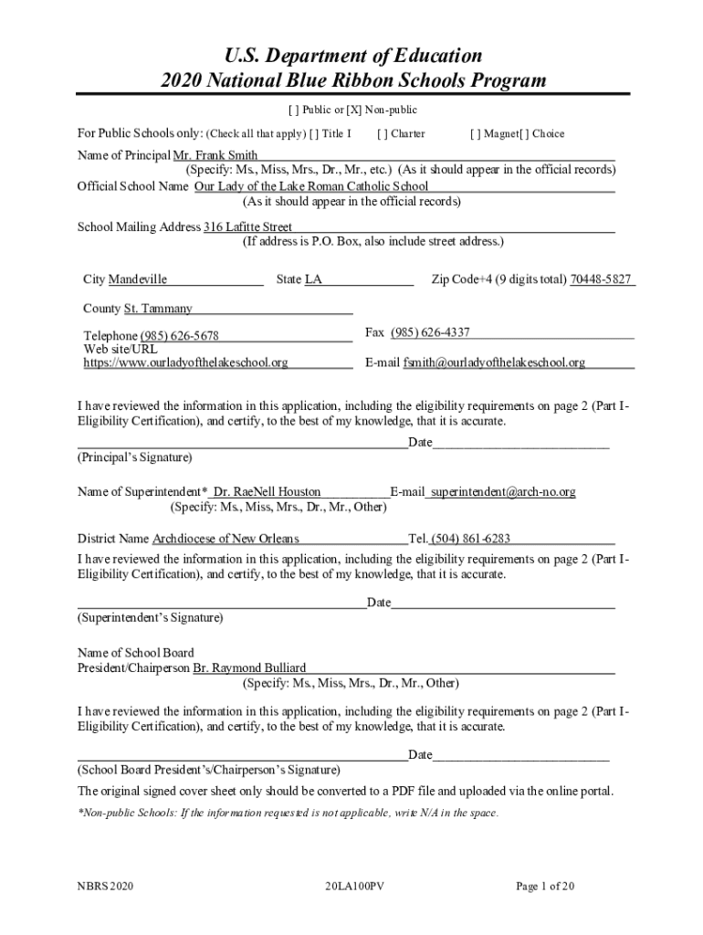 U.S. Department of Education 2020 National Blue Ribbon Schools Program Public or X Nonpublic Public Schools only: (Check all that apply) Title I Charter Magnet ChoiceName of Principal Mr. Frank Smith