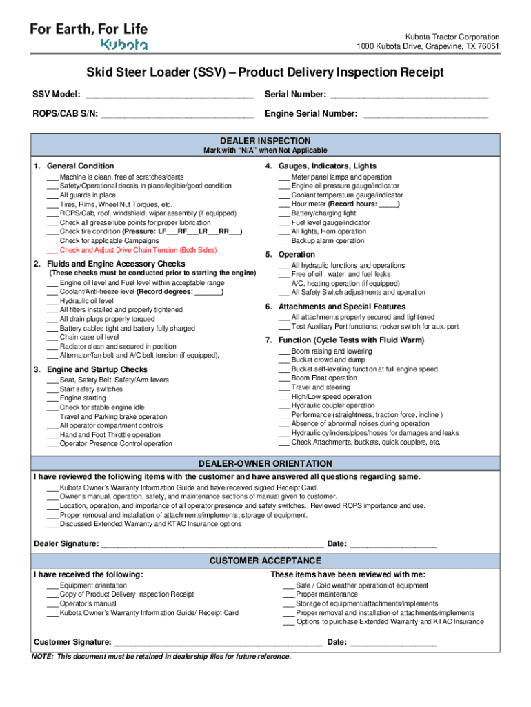 Quota Tractor Corporation 1000 Quota Drive, Grapevine, TX 76051Skid Steer Loader (SSV) Product Delivery Inspection Receipt SSV Model: Serial Number: CROPS/CAB S/N: Engine Serial Number: DEALER INSPECTION
