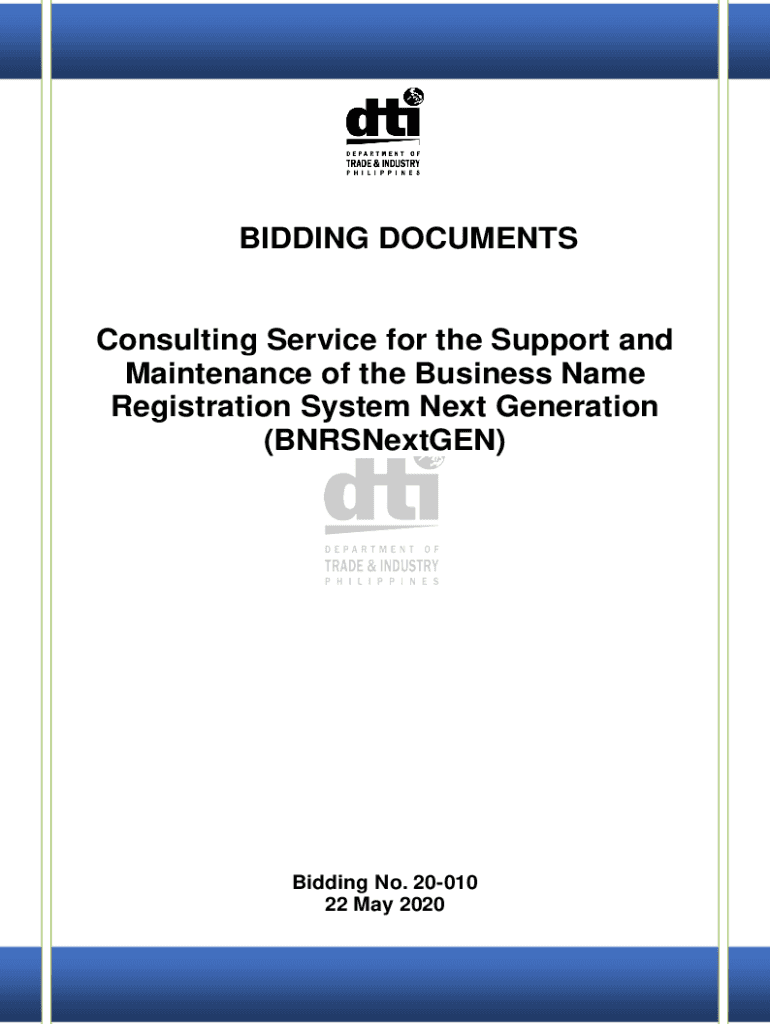 BIDDING DOCUMENTSConsulting Service for the Support and Maintenance of the Business Name Registration System Next Generation (BNRSNextGEN)Bidding No. 20010 22 May 2020TABLE OF CONTENTS PART I SECTION