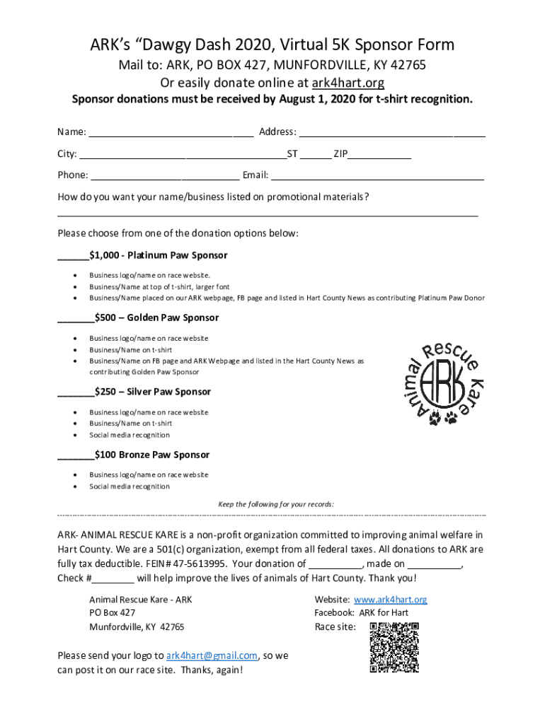 Arks Dawg Dash 2020, Virtual 5K Sponsor Form Mails to: ARK, PO BOX 427, MUNFORDVILLE, KY 42765 Or easily donate online at ark4hart.org Sponsor donations must be received by August 1, 2020, fort shirt