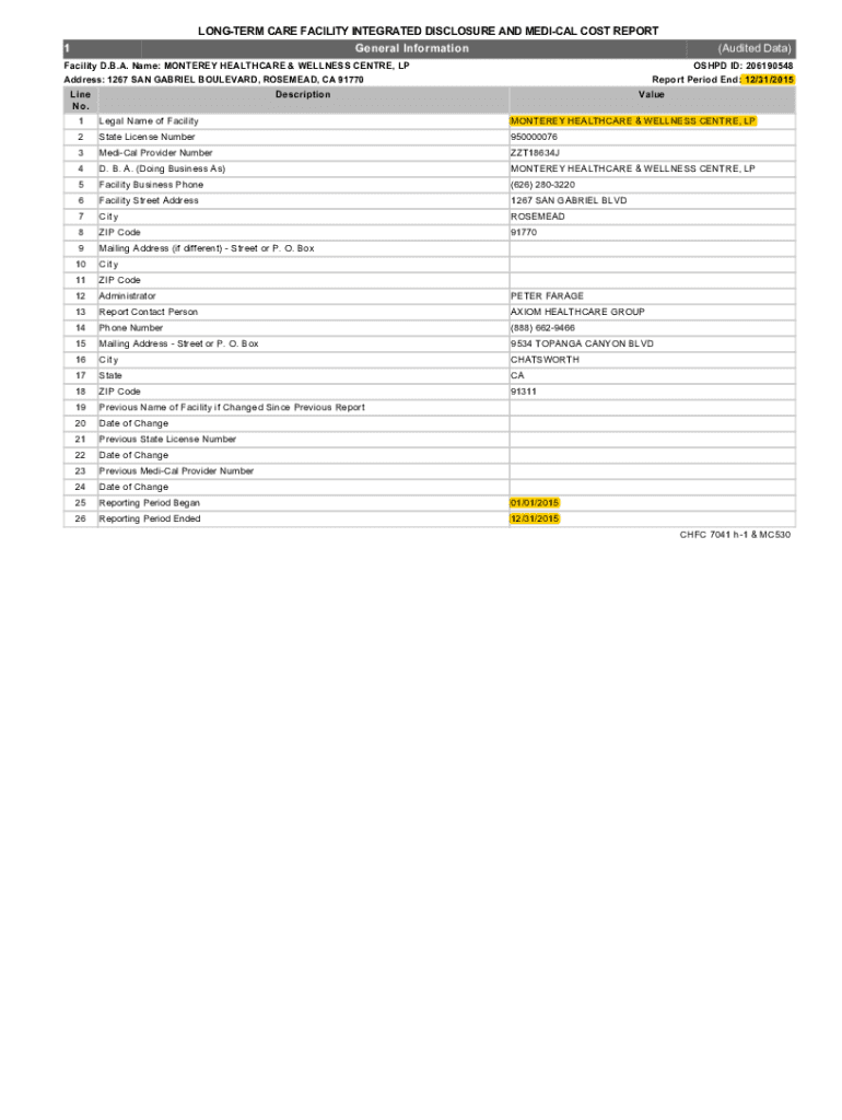 LONGTERMCAREFACILITYINTEGRATEDDISCLOSUREANDMEDICALCOSTREPORT GeneralInformation1FacilityD. B.A. Name:MONTEREYHEALTHCARE&WELLNESSCENTRE, LP Address:1267SANGABRIELBOULEVARD,RESUMED,CA91770 Line No.(AuditedData)SHADED:206190548