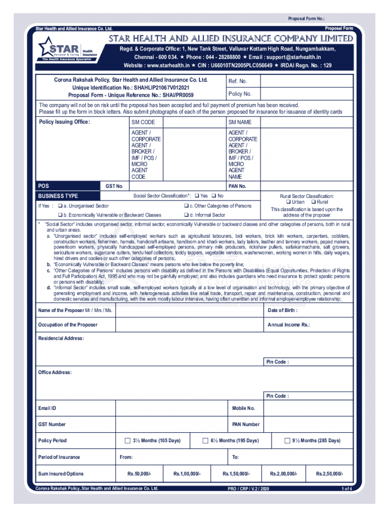 This document serves as a proposal form for obtaining the Corona Rakshak Policy from Star Health and Allied Insurance Company Limited, detailing the necessary information required for insurance coverage