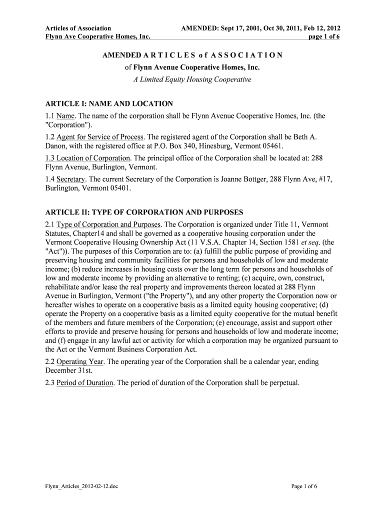 Articles of Association Flynn Ave Cooperative Homes, Inc. AMENDED: Sept 17, 2001, Oct 30, 2011, Feb 12, 2012 page 1 of 6 AMENDED A R T I C L E S o f A S S O C I A T I O N of Flynn Avenue Cooperative