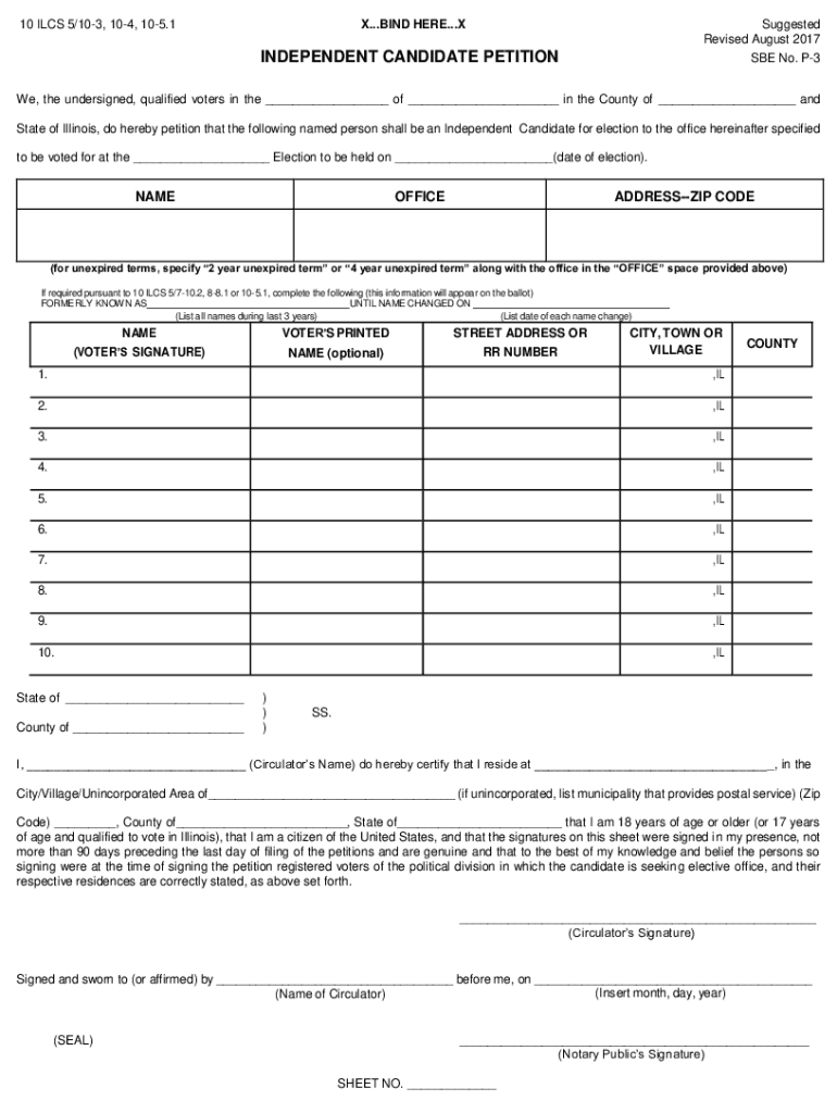 10 ILLS 5/103, 104, 105.1X...BIND HERE... Suggested Revised August 2017 BE No. P3INDEPENDENT CANDIDATE Petition, the undersigned, qualified voters in the of in the County of and State of Illinois,